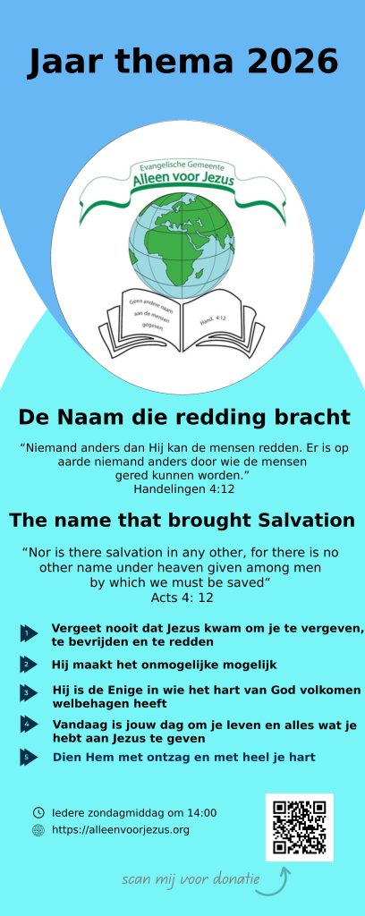 Who are we We are an Evangelical Church that beleives in God the Father, the son and the Holy Spirit Our Vision Our vision is to announce the good news. Calling people to repent in Jesus his name. He has given us the assignment to make disciples, not only in the Netherlands but all over the world. (Matthew 28:18-20) Our Mission Ever tongue shall confess that Jesus is Lord and every knee shall bow for his glory. We want to be a church after God’s heart, where people look out for eachother. Jesus Christ is our biggest example and the Bible is the starting point.(Philippians 4:10-11) We believe In the power of prayerThat only a praying Church can come to fulfillment in God’s planIn God the Father, God the Son and God the Spirit This is the foundation of our faith Church statistics : 0 2022-2023 Baptisms 0 Members until 2023 0 Activities 0 Children Alleen voor Jezus Evangelische gemeente Alleen voor Jezus was founded on july 2 in 2006 in oude pekela by the leadership of Rv Don João. After the voice of God was heard (Isaiah 54:2). I shared the word with my brothers and sisters with whom we were always togehter with in the house praying ,doing evangelism work and also visiting people. It was a really small place where we started but new people were always coming to pray with us and experience the power of God togehter through the guidance of the Holy Spirit. At the same time the Lord also gave me the name Only for Jesus. Acts 4:12 contains the explanation and meaning of this powerful name. Kvk : 01134478RSIN : 819680485 Zuiderstraat 10, 9671GP Winschoten Evangelische Gemeente Alleen voor Jezus Financial accountability BUDGET 2023ACTUAL 2023BUDGET 2024 BENEFITS Offerings25002057.293000 Donation5000500 Total Benefits30002057.293500 --- CHARGES Rent 180018001800 Church activities283450550 Pastorial duties600622.2750 Bank account insurence117117117 Special costs200551283 Total Charges30003540.23500 Results0.00- 1482.910.00